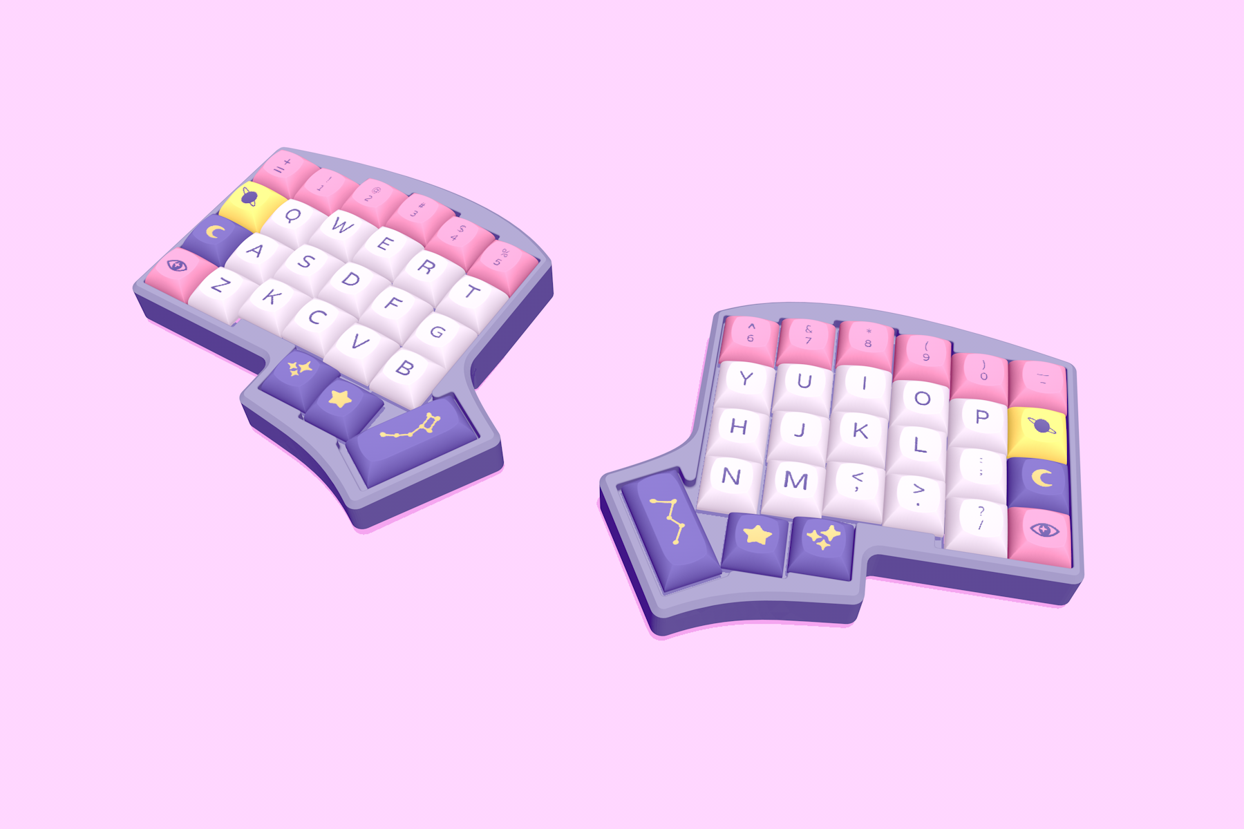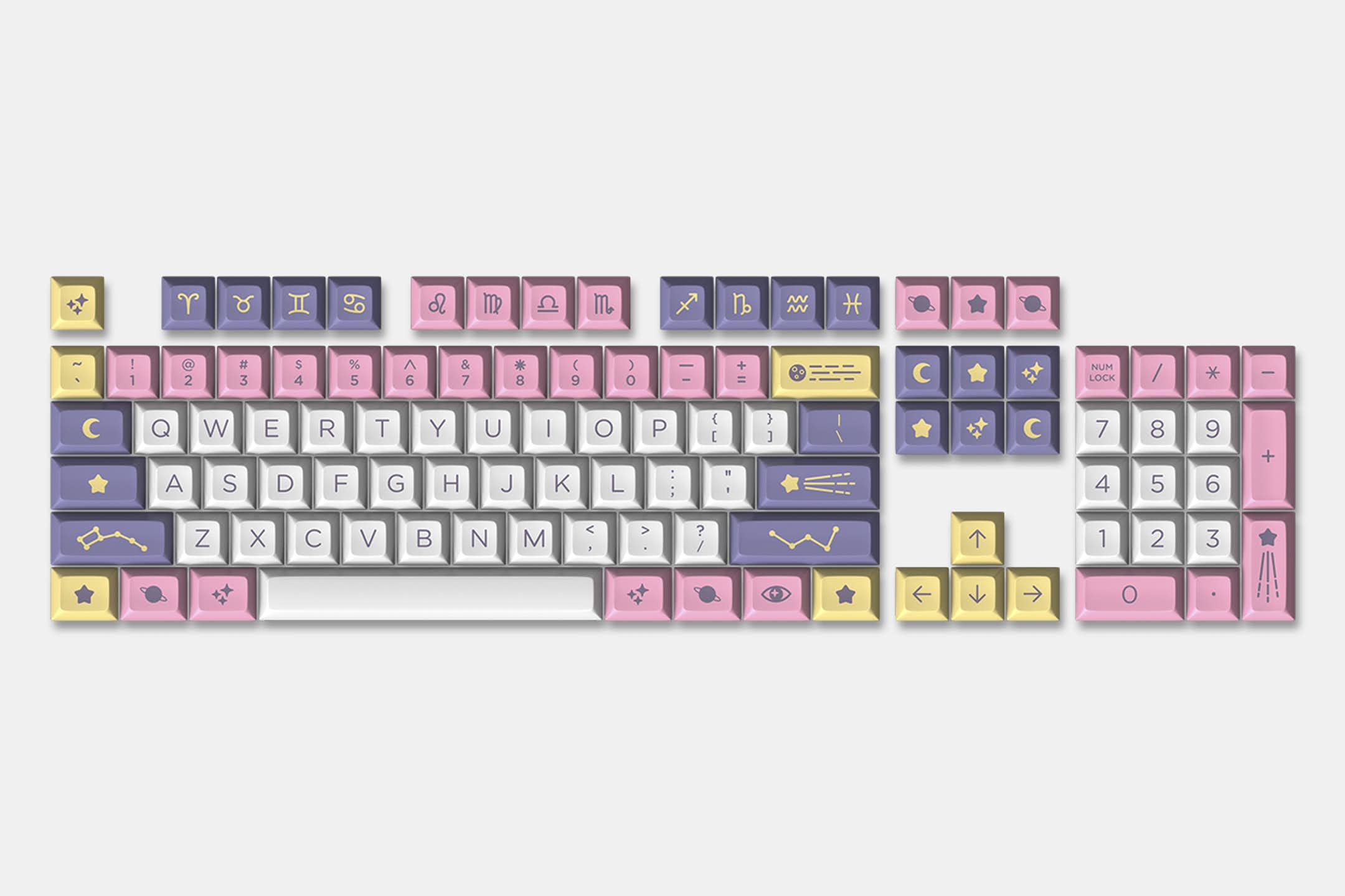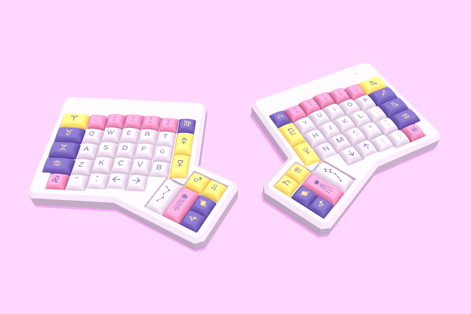 Astrolokeys are a pastel astrology-themed keycap set designed by cassidoo and sailorhg, featuring stars, moons, constellations, zodiac symbols, and planet symbols! They take inspiration from intersections of magic and technology, including the second paragraph of Structure and Interpretation of Computer Programs, Jenny Calendar from Buffy, and Sailor Mercury's magic supercomputer. You can put them on your keyboard to make your desk space super cute and magical!