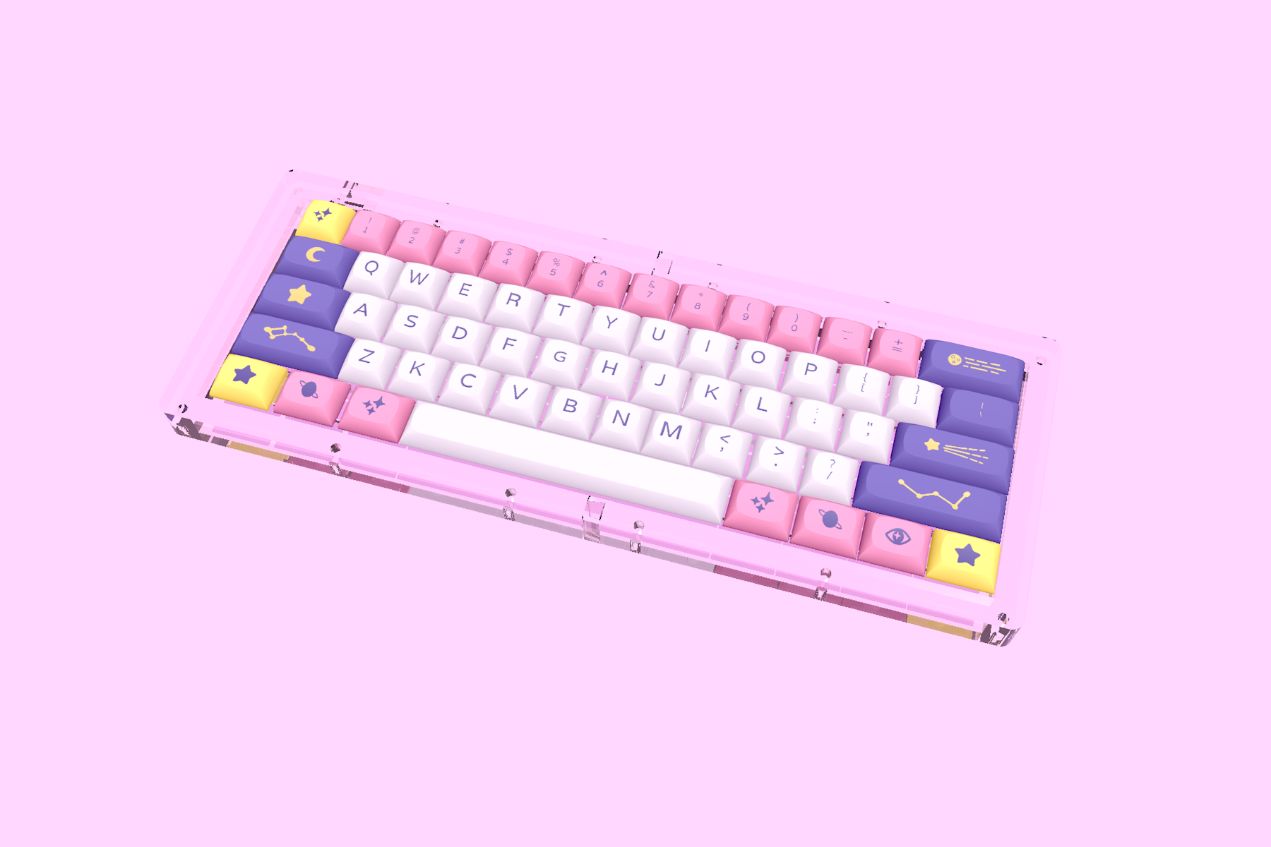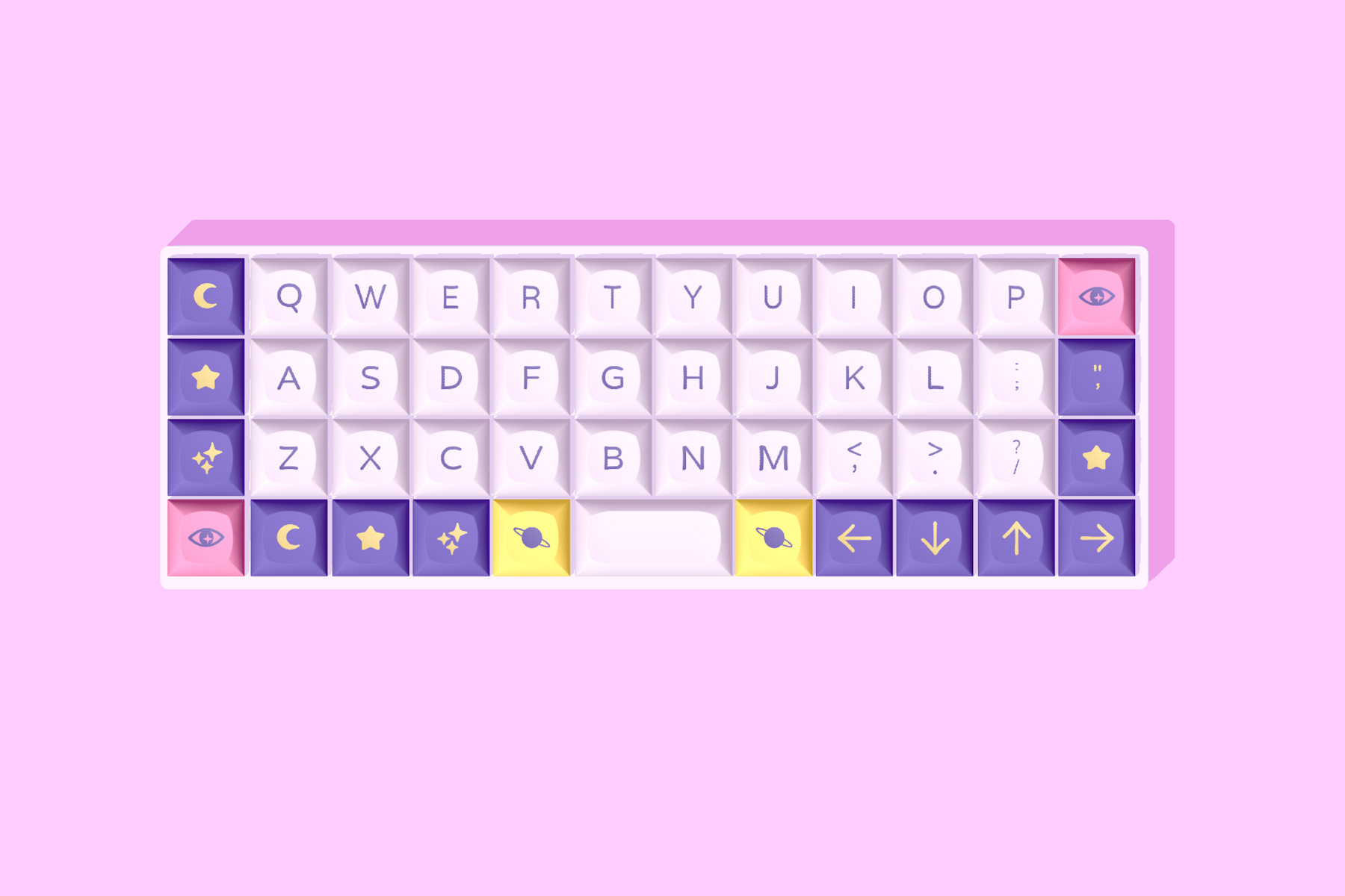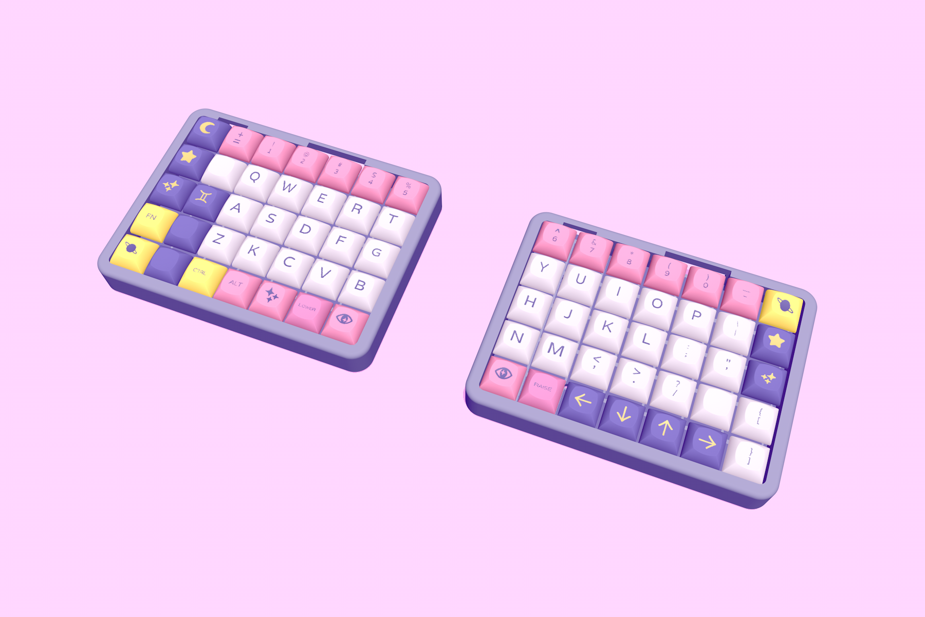Astrolokeys are a pastel astrology-themed keycap set designed by cassidoo and sailorhg, featuring stars, moons, constellations, zodiac symbols, and planet symbols! They take inspiration from intersections of magic and technology, including the second paragraph of Structure and Interpretation of Computer Programs, Jenny Calendar from Buffy, and Sailor Mercury's magic supercomputer. You can put them on your keyboard to make your desk space super cute and magical!